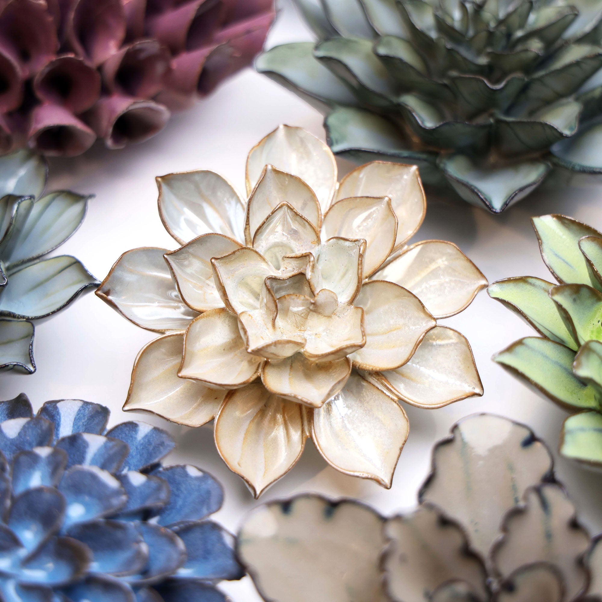 In times of crisis, I've found that people obsess over peculiar solutions for empty kitchen walls. While my sister spent six weeks creating wall art from vintage soup can labels, my latest fixation – a medium-sized ceramic flower in lustrous metallic, like moonlight captured in clay – feels surprisingly sophisticated.