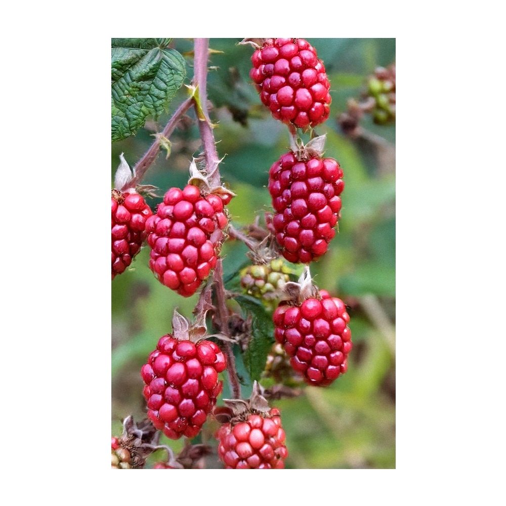 Tummelberry (Rubus fruticosus × R. idaeus) is a vigorous hybrid between raspberry and blackberry, developed in 1984 by the Scottish Crop Research Institute (SCRI). This bramble produces large, round, bright-red berries that resemble raspberries in appearance but carry a juicy, sweet-tart flavor with blackberry-like depth. Tummelberries ripen from mid-July through late August, offering an extended summer harvest that’s ideal for fresh eating, preserves, desserts, or freezing.